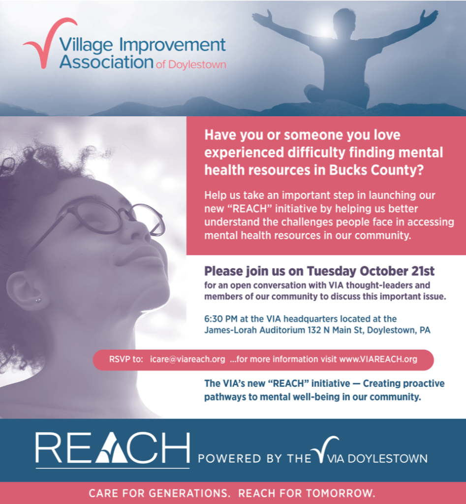 The event will bring together VIA thought-leaders, representatives of mental health organizations and local residents for a collaborative discussion about the challenges individuals and families face in finding accessible mental health resources in Bucks County. Insights gathered from this conversation will help shape the VIA’s REACH initiative and ensure it addresses the most pressing needs of the community.